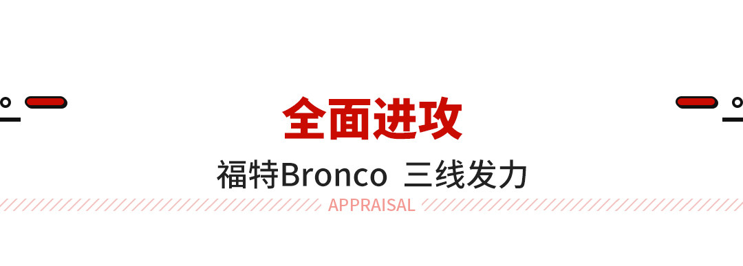 Bronco主打3个方向:硬核Bronco两门版、均衡Bronco四门版、兼顾公路和越野性能的Bronco运动版。毋庸置疑,Bronco就是冲着Jeep 牧马人来的,基本上牧马人有的东西,Bronco都有,牧马人没有的东西,Bronco也有。