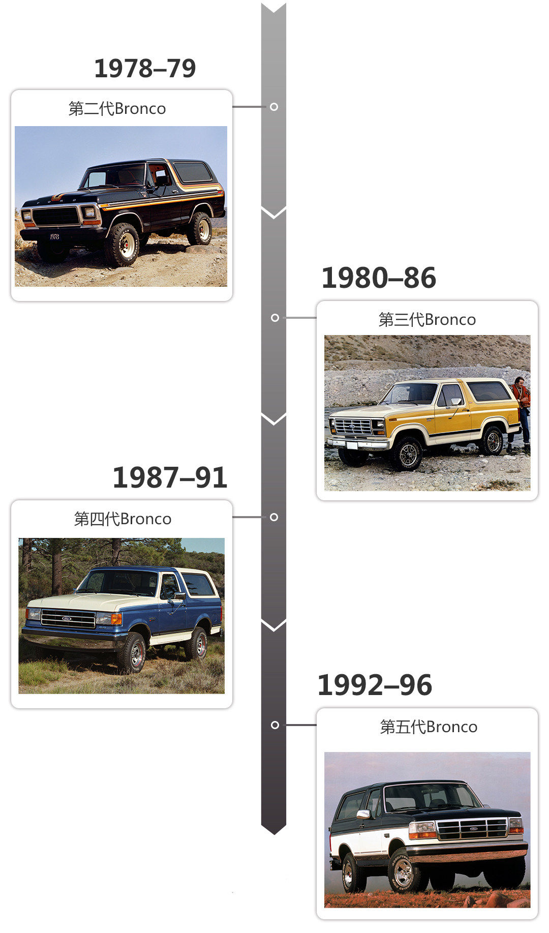 90年代以后至今,消费者对SUV的需求从越野性能转变成公路舒适性,往后的二十几年里面,SUV消费从越野车向城市SUV改变,这段时间Bronco缺席了,因为福特在这段时期有非常成功的公路型SUV产品和工具车型:探险者、F系列皮卡。