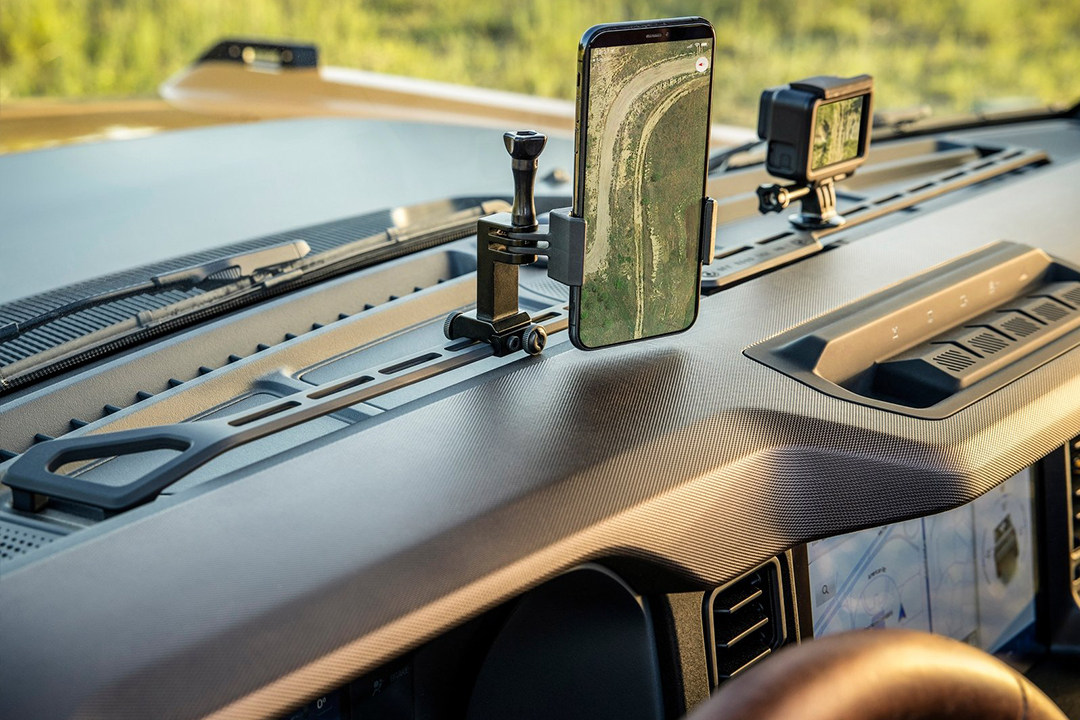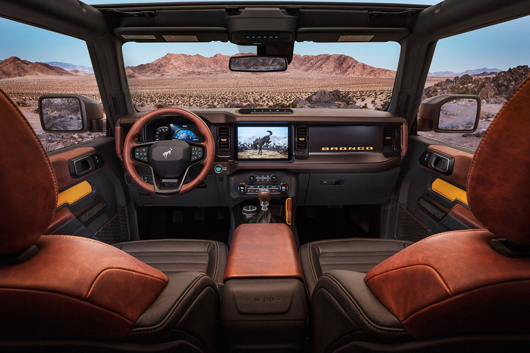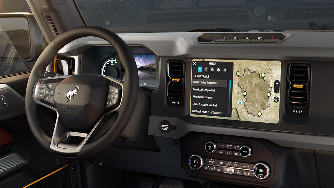 所以Bronco的车内搭载了全新的12英寸中控屏,配备福特最新的SYNC®4系统,具备互联功能,车载导航集成了高级地形线图和越野路线指南。