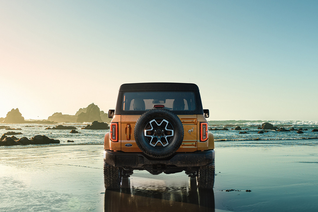 Bronco继承了F系列皮卡的强悍和Mustang的性能精神,拥有跟牧马人不相上下的越野能力,两门版和四门版有着同样的通过性:11.6英寸(29.46厘米)离地间隙、29度接近角、37.2度离去角,配备35英寸巨大轮胎,非承载式车身。