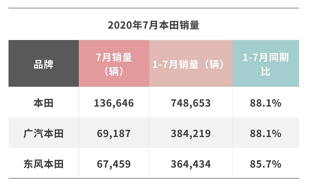 2020年1~7月本田在中国的终端汽车累计销量为748653辆,同期比86.9%。其中,广汽本田2020年1~7月终端累计销量为384219辆,同期比为88.1%。东风本田2020年1~7月终端累计销量为364434辆,同期比为85.7%。