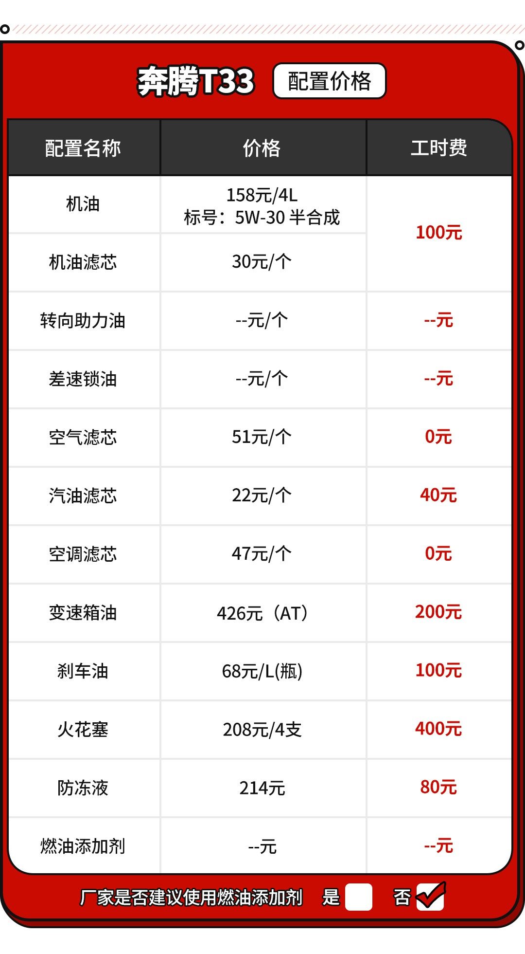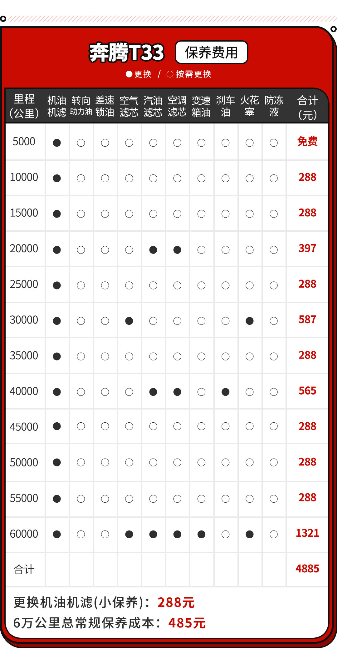 是的没错,T33每一次的小保养算下来只要288元,300元不到的价格就能完成一次在4S店里的常规保养,反观一些合资车型动则5、600,贵则7、800的价格,买买君表示真的很良心。