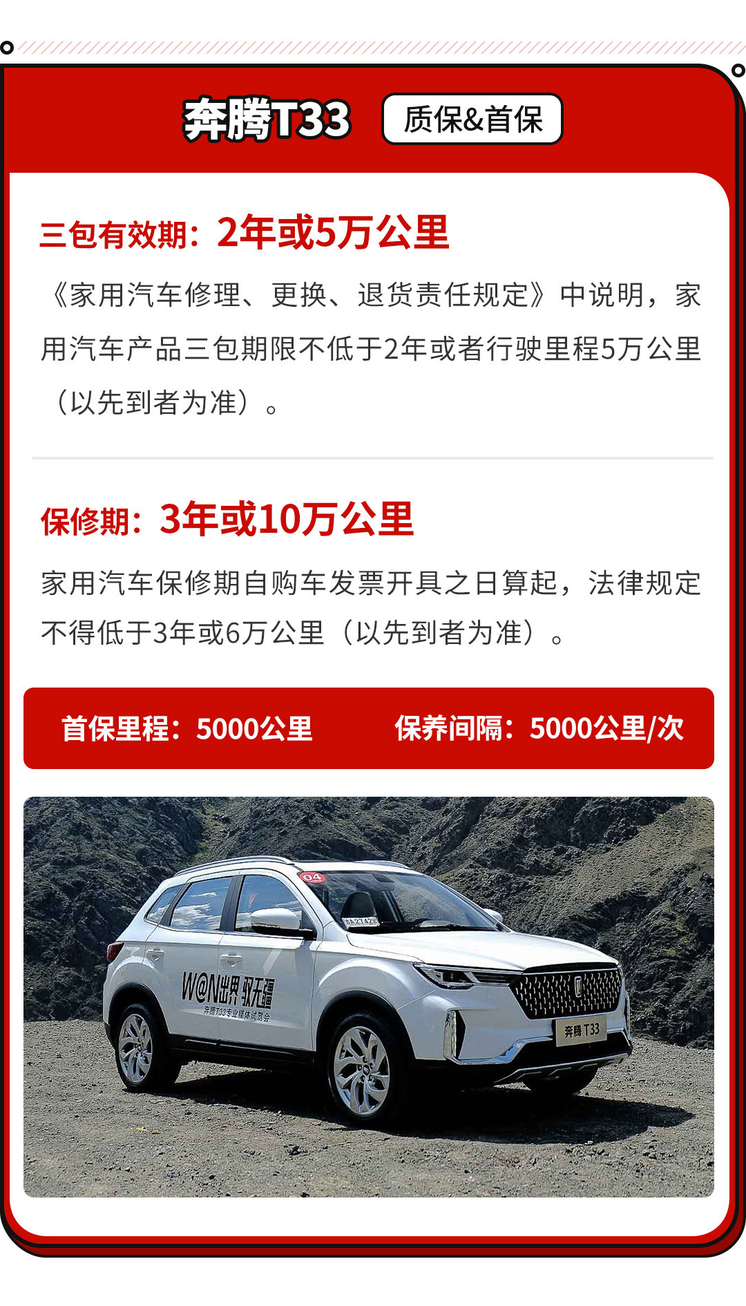在质保方面,该车需要在5000公里的时候进行首次保养,而在此后每5000公里进行一次常规保养,对于同级来说也是正常水平,并不算有较长的保养周期。