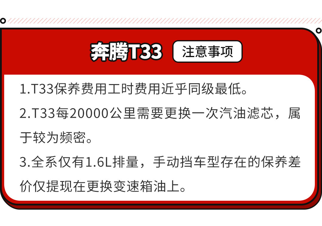 整体来说,奔腾T33在自身上有着较为出色的产品力,7万元不到的价格就能买到同级中10万元的配置。而重要的是,不少人担心的保养成本问题,T33更是给了不少人惊喜,完全不必担心存在着负担压力,这对于预算并不充裕的年轻用户来说确实是不错的选择。