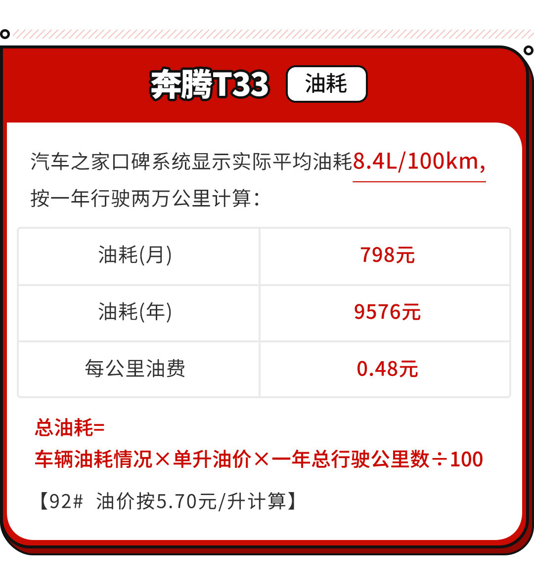 不过在油耗方面,该车的表现就只能算是中规中矩了,8.3L/100km的数据并不算十分出色。平均算下来每个月的花费800元不到,每公里也只要0.48元,这样的价格其实还算在接受范围。
