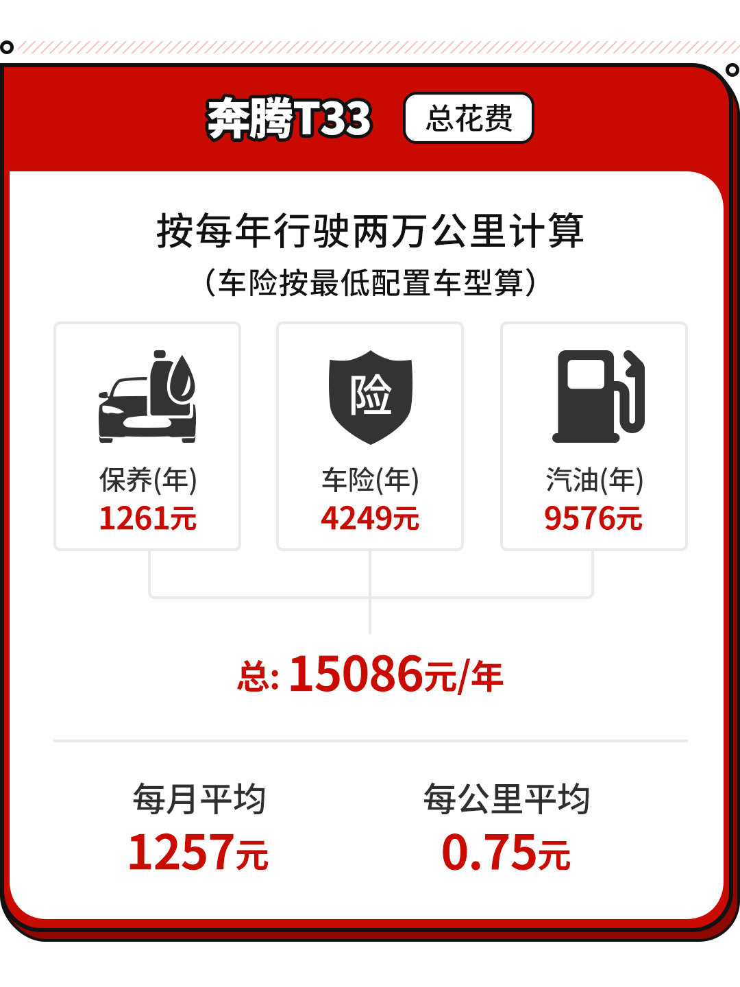 最后在整体用车费用方面,T33的表现也还是在中上水平吧,算上各种费用之后,每个月花费1257元,平均每公里花费0.75元,相比大多数需要去到0.8几的车型来说,还是有着一定的优势。