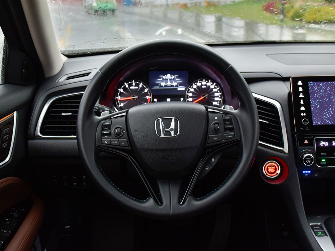相对而言,冠道的内饰则要传统很多,中控台采用对称式设计,再加上桃木纹饰的加入,以及大屏下空调按钮的保留,多少能体会到一些旧式中控设计的情怀所在,不过方向盘以及空调出风口的多处镀铬饰条增加了车内的精致感。