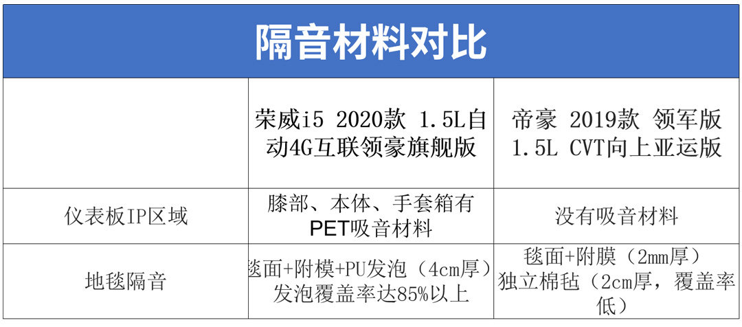 相反,帝豪则没有吸音材料,门板PET吸音材料厚度和面积都不及荣威i5,地板隔音垫也比荣威i5薄2cm、独立棉毡覆盖率低,相比之下高低立判。
