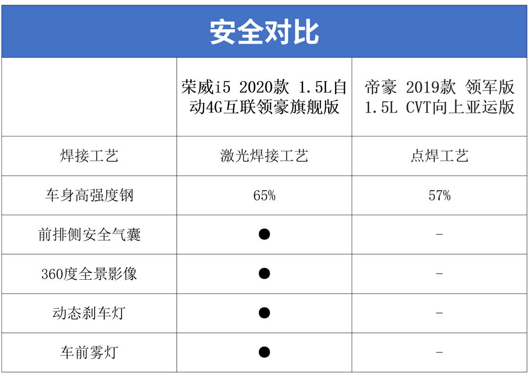 从结构上来说,荣威i5高强度钢占比达到65%,优于帝豪的57%。帝豪采用电焊工艺焊接,而荣威i5采用车身激光焊接工艺,保证焊接区域精密牢固,不透气不漏水,车身刚度比采用点焊工艺的车型提高约30%.
