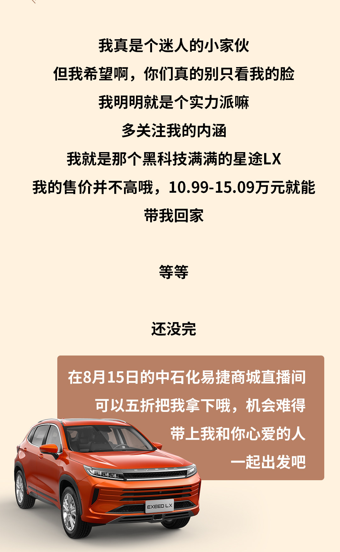 即日起到8月15日20:00,到中石化易捷商城小程序直播间参与报名 ,5折星途汽车及易捷免费大礼包等你来。