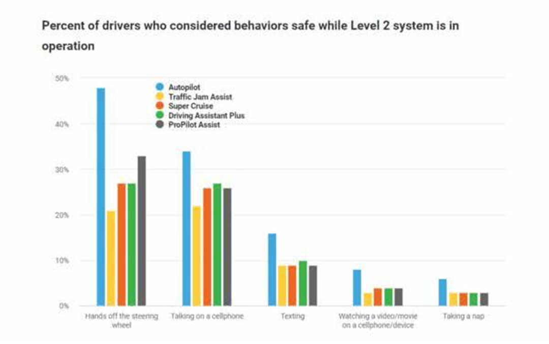可就是这种高调的宣传加上表现出的不错产品实力,让许多消费者开始盲目相信特斯拉的自动驾驶系统,根据美国IIHS(高速安全保险协会)的调查显示,有高达百分之48的特斯拉驾驶者认为在FSD功能启用后,双手离开方向盘是安全的行为;更为夸张的是还有6%的驾驶员认为在FSD功能开启后,打瞌睡也是安全的行为。