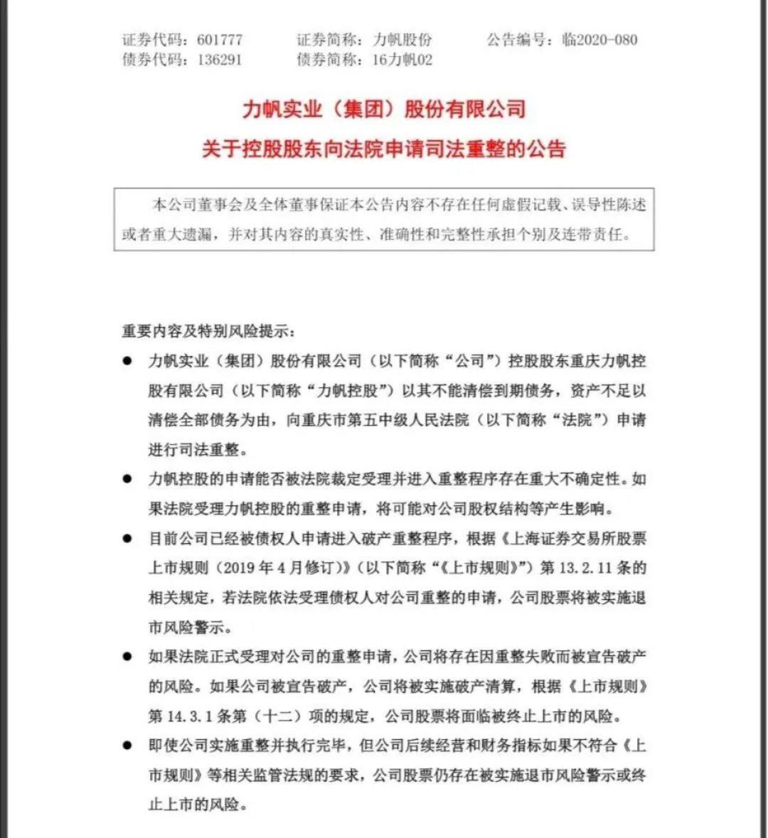日前,力帆股份对外发布公告,由于重庆力帆控股有限公司无法清偿到期债务,资不抵债,已经向重庆市法院申请司法重整,公司已经被债权人申请进入破产重整程序。公告中指出,力帆控股共持有力帆股份6.19亿股,占总股本的47.08%。