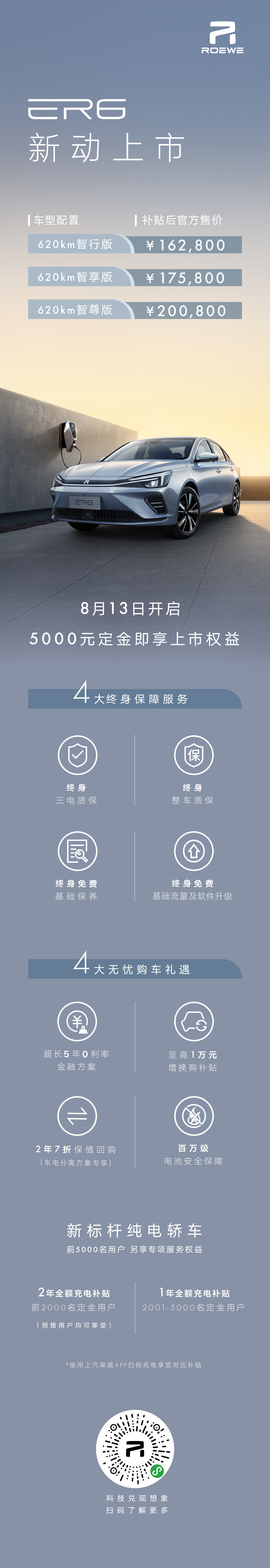 8月13日,上汽荣威高端纯电R标首款旗舰轿车,续航“芯”霸王荣威R ER6正式上市,共推出三款车型,补贴后官方指导价16.28-20.08万元。新车集结了上汽在三电技术、设计、智能等方面的优势,以同级最长续航、最快充电速度和最低百公里电耗的超强实力,完美诠释了荣威R标“科技兑现想象”的理念。配合4大终身保障服务及4大无忧购车礼遇,全方位满足都市年轻消费者对高品质纯电出行的所有想象。活动现场,青年实力派男演员朱亚文登台“献声”,并倾情担当“ROEWE R 挚友”为荣威R标站台,见证荣威R ER6“芯”动上市!