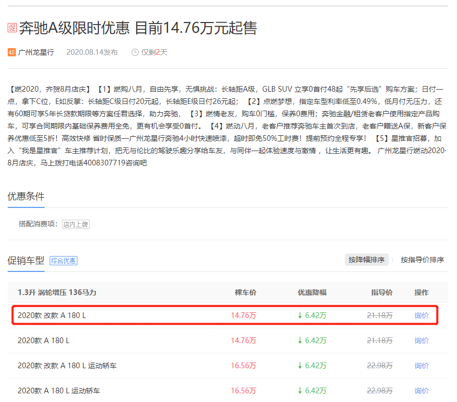 奔驰A级以广州地区为例,市场终端综合优惠为6.42万元,那么低配奔驰A级售价为21.18万元,裸车价去到14.76万元。