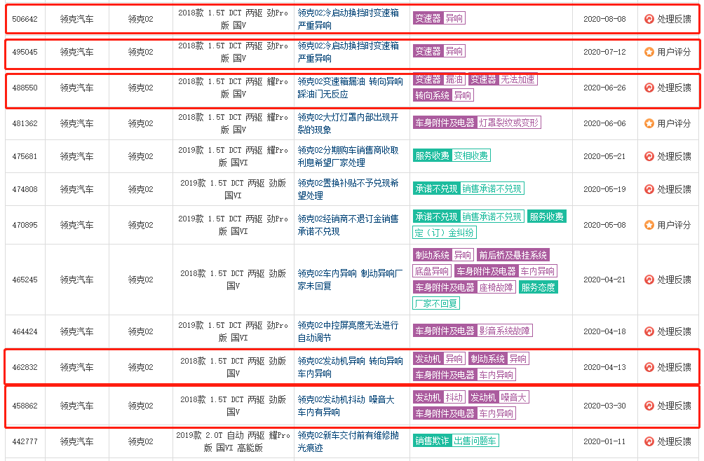 吉利品牌和领克品牌大量采用三缸机的行为,市场表现和消费者口碑生动反映了其动力系统上的缺陷。以前辈领克02来看,1.5T三缸+7速双离合变速箱的动力总成,在车质网投诉中占了主导地位,不仅1.5T发动机存在异响,其7速双离合变速箱也有顿挫异响等问题。