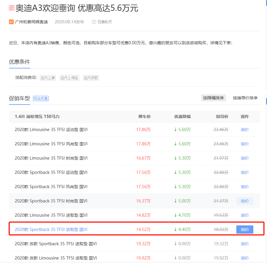 以同级别BBA豪华品牌入门级车型售价优惠做个对比分析,奥迪A3和奔驰A级,领克06市场售价优惠,一一对比。以广州地区为例,奥迪A3市场终端优惠为4.4-5.6万元之间,低配车型奥迪A3售价18.92万元,那么裸车价去到了14.52万元。