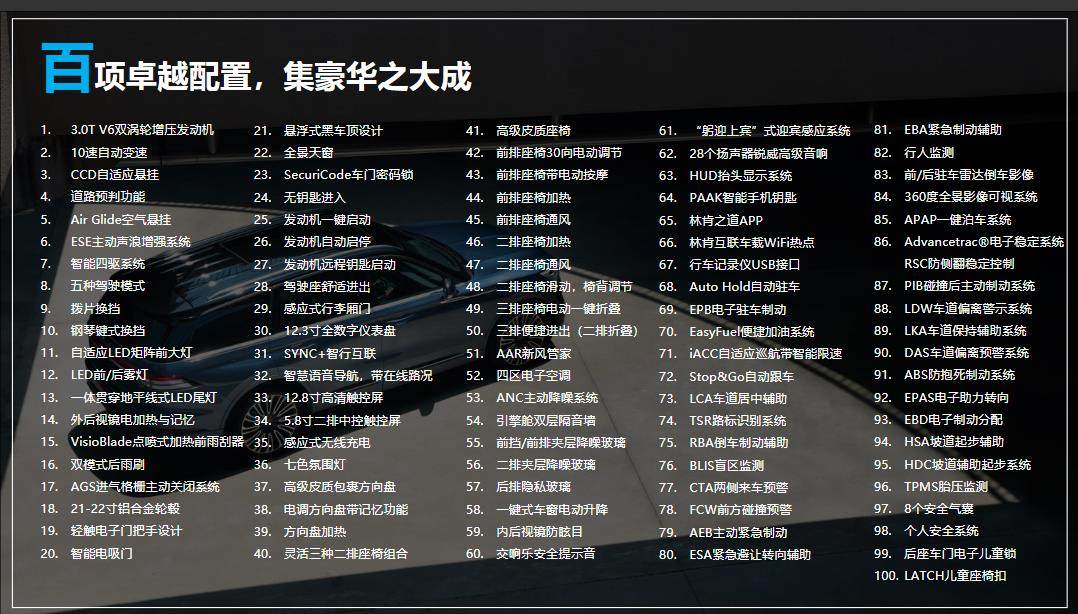 国产林肯飞行家不玩虚的,给你的都是切切实实的东西,稍微数了一下,国产林肯飞行家有多达100项配置,有很多都是同级别所没有的,比如扬声器都是28个(比进口版多14个,不过只有行政版跟总统版配备),给你试听的盛宴。