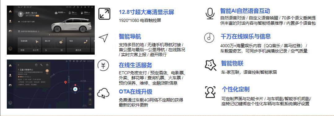 前面说了飞行家有百项配置,一个一个找太麻烦了,此时只需说:你好,林肯,帮我打开副驾(主驾)座椅按摩。SYNC+系统很快识别你的意图,然后精准的为你服务了。智能AI语音互动、智能导航、在线生活服务、OTA在线升级等功能都是非常实用的。
