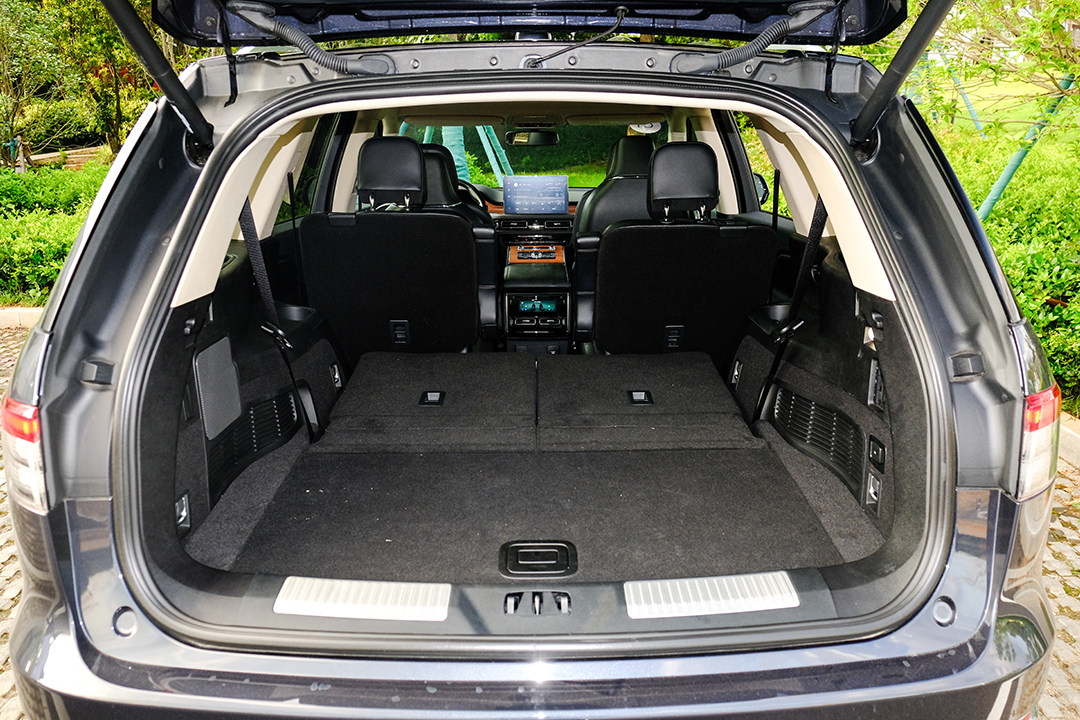 二三排座椅一键折叠,可以得到全平的后备厢空间,此时容积为2044L,放下一张床都没有问题。即便是三排全部满员的情况下,后备厢依然有302L空间,行李箱隔板下面还有52L隐藏空间,出行无忧。