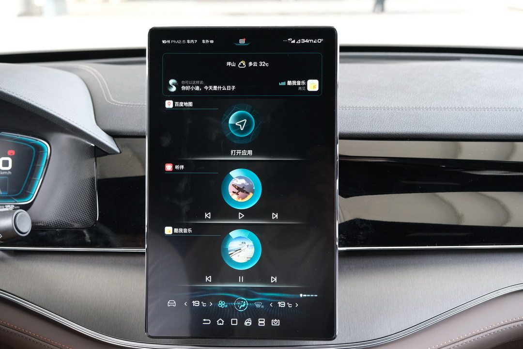 我一直调侃比亚迪在车内装了一个安卓平板,这次比亚迪顺便追上了全面屏的潮流,把边框做得更薄。依托安卓的生态系统,比亚迪的这块12.8英寸可旋转中控屏十分好用,功能丰富,在车上打游戏完全不在话下,把屏幕竖起来刷抖音也是小菜一碟。这个中控屏使用了最新的DiLInk 3.0智能网联系统,加入了科大讯飞的语音识别技术,可以实现智能化语音指令。