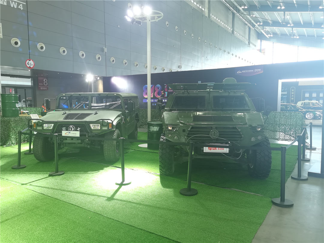 首先映入眼帘的就是两辆高大威猛的东风猛士通用型和东风猛士防护突击型,东风猛士素来有着中国悍马的称号,而东风猛士防护突击型更是中国军队新一代机动作战、指挥和轻武器装备运载平台,具备在各种复杂地形和松软地面等极端地理环境下的机动能力和环境适应能力。