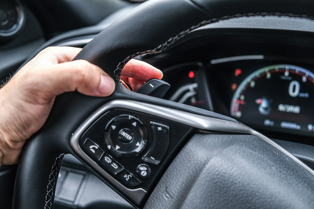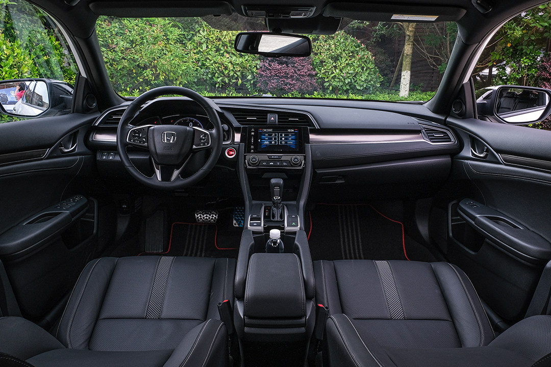 配备真皮方向盘,触感细腻顺滑,如果你是手动挡爱好者,思域Hatchback手动挡还配备了Si版本的挡把头,铝+皮革把手和短柄带来刚性更强和更有快感的换挡行程,对于操控的手感也大有裨益。