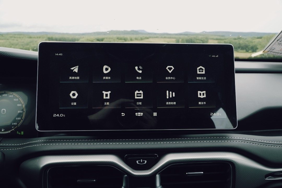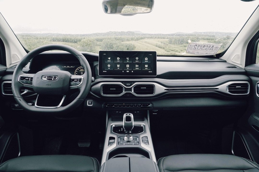 豪越的内饰设计风格还算挺时尚的,通过贯穿式饰板连接的空调出风口,再加上层次感丰富的设计基调,几乎能让人忘记这是一辆顶配不到14万的车,教授不得不感叹如今自主品牌车型在内饰设计上的进步。