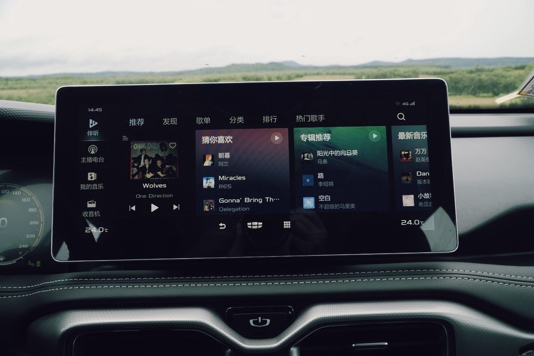 中央显示屏同样是12.3英寸,显示效果清晰,操作的流畅度很好,除了常规的功能以外,还支持车联网,通过网络观看节目、收听音乐也是相当不错的。不过本次试驾的场地由于信号不好,网络音乐经常处于“失联”状态。