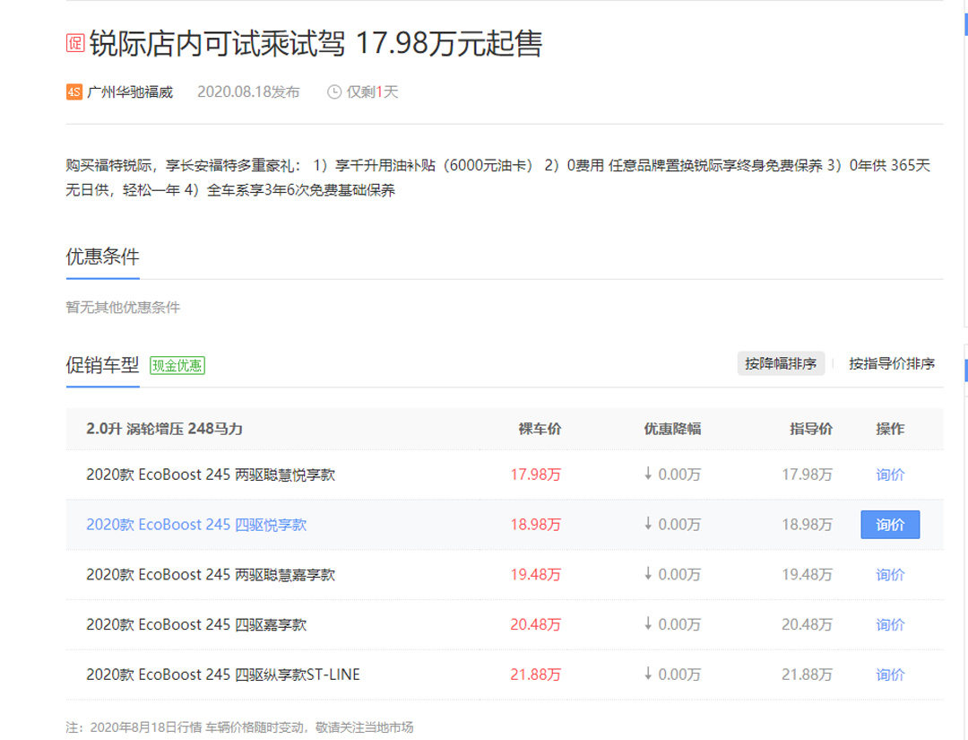 现在,从广州地区的福特锐际报价情况来看,没有加价提车的现象,而售价却是十分坚挺,没有任何的现金优惠。为了向下延伸车型价格和符合更加消费者的购车多样性,福特锐际在后来增加了两款两驱车型。