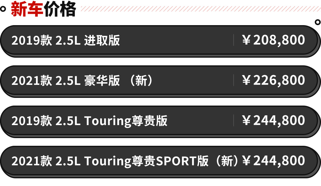 另外2021款2.5L Touring尊贵SPORT版和原有的2.5L Touring尊贵版售价一致,两者除了配置上的小区别,SPORT版也提供了更运动的设计,同时也是主要的升级。
