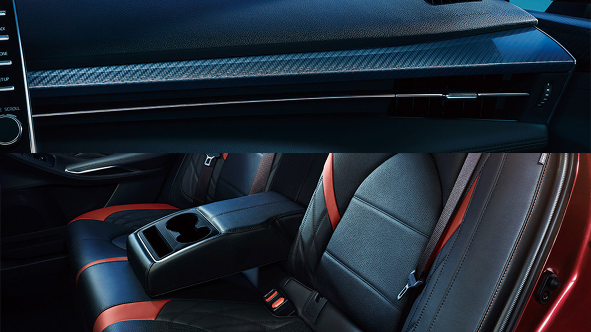 车内也有不同,新车内饰以黑配色为基调,中控装饰面板同样采用镭雕碳纤纹理,再加上红黑撞色的前/后排真皮座椅,让车内充满运动气息。