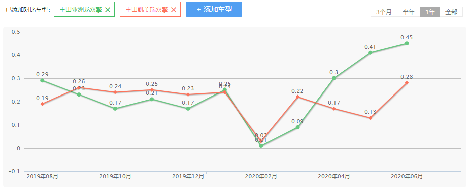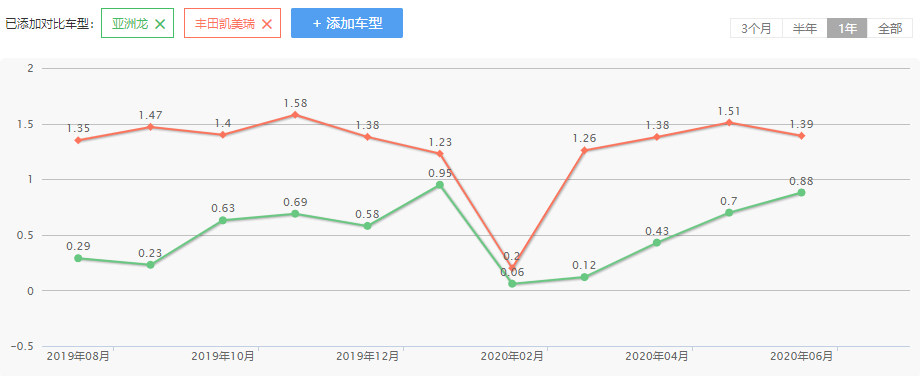 但值得一提的是,即使在燃油车型方面亚洲龙处于落后状态,不过混合动力版块却是另一番景象。从对比图可见亚洲龙双擎的销量不仅与凯美瑞双擎走势相当,甚至近几个月都超过了凯美瑞双擎。从中也能说明市场对亚洲龙,或者说对丰田混合动力的认可度还是挺高的。当然了,亚洲龙2.5L双擎入门版(22.68万)价格比凯美瑞2.5L双擎入门版价格(23.98万)更低,这也起到不少推动作用。