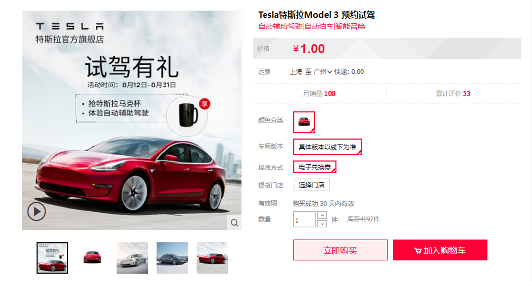 在近期正值是不少车企与天猫联合做优惠活动,但我们再来看一下特斯拉的车型,你并不能在旗舰店上看到关于购买的消息或链接,最多也只是能预约试驾,相比传统品牌来说要显得“高冷”不少,优惠更是想都别想了,最多也就送你一个杯。