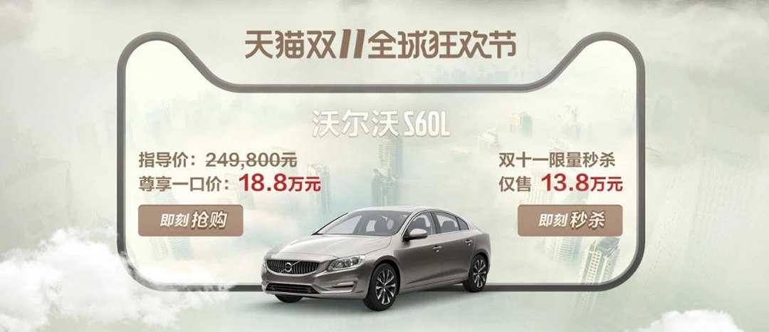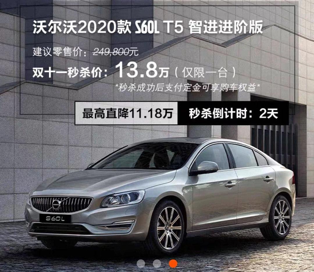 难道车企的合作都是这样,那其他品牌又有没有过呢?那肯定还是有的,这其中大家听得最多的应该就是沃尔沃S60的优惠活动了。众所周知,沃尔沃在豪华品牌这一个行列里,优惠幅度一直都是比较大的,但是在之前与天猫的合作中,一台售价24.98万元的S60L直接给出了11万的优惠,只要13万就可以拥有一辆豪华品牌B级车。