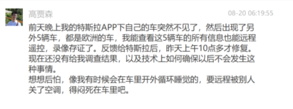 特斯拉最近热点不断,这个星期与拼多多大战已经上了不少头条。就在8月20日,一位车主爆料自己的特斯拉APP出现bug,在自己的APP上,自己的车辆消失,但是却出现了另外五台特斯拉(欧洲的)。车主表示,特斯拉的APP拥有远程控制功能,如果自己的车辆被黑,很有可能造成安全事故。当然,这个bug在8月19日已经修复,但是车主未收到关于此次bug的说明以及以后的改进事宜。
