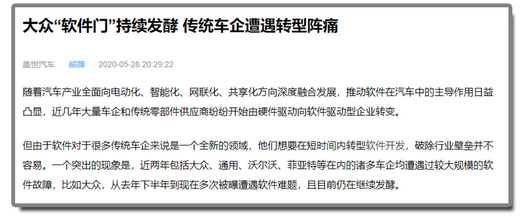 就在今年5月份,大众的软件门爆发,由于新开发的软件故障不断,大众的第八代高尔夫、ID.3,斯柯达的明锐都受到不同程度的牵连,导致车辆无法如期交付。