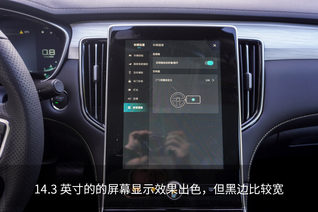 14.3英寸中控大屏屏幕效果较为出色,不过由于现场车辆并没有激活车机系统,所以未能体验。此外实际观感14.3英寸的的屏幕直觉感受并没有那么大,而且两侧的黑框也较为明显,如果能够缩小黑边,那么感受会更加好。