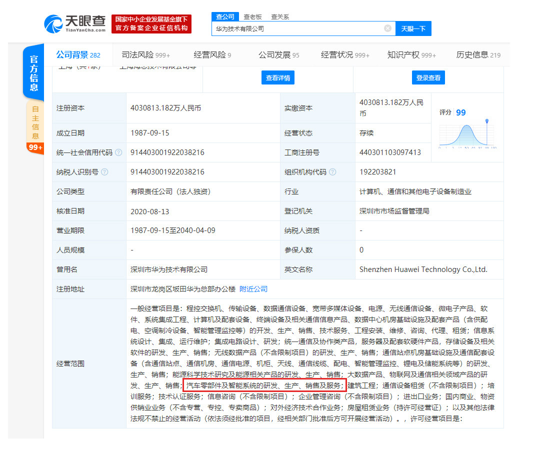 在天眼查中搜索华为技术有限公司就能发现,公司在原有的无线通信设备、微电子产品等业务下,新增加了“汽车零部件及智系统的研发、生产、销售及服务”这一板块。说明华为在电子设备领域后,也将涉猎汽车市场。