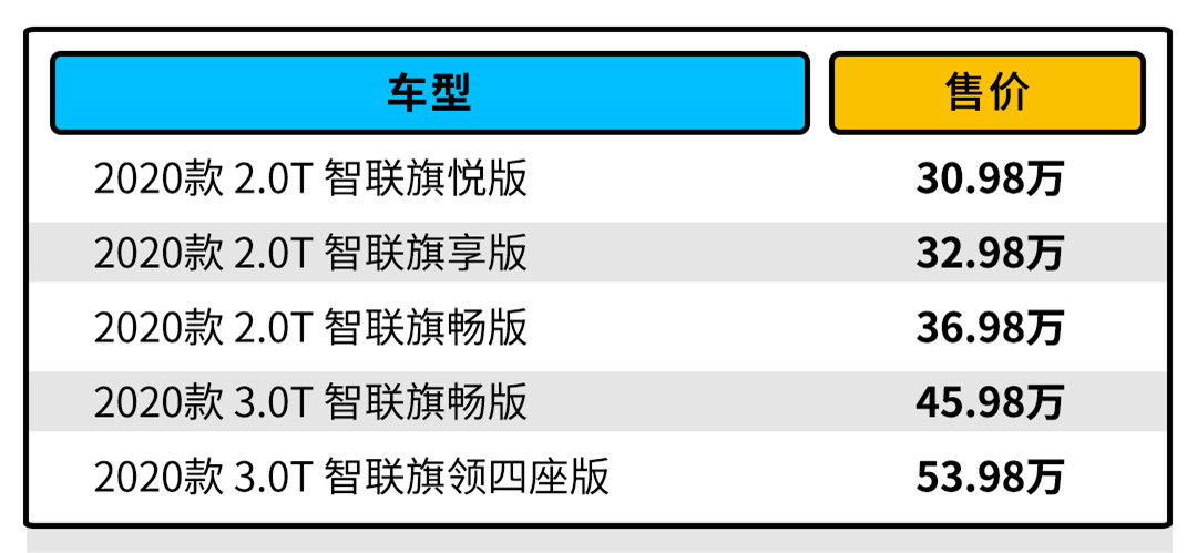 2.0T旗享版比入门的2.0T旗悦版贵了两万,但舒适性和安全性配置多了不止一两样,非常划算,故2.0T旗享版是买买君比较推荐的款式之一。而2.0T旗畅版的配置丰富程度则更进一步,比2.0T旗享版多花四万块也不算冤。至于3.0T旗畅版,它与2.0T旗畅版主要区别在于发动机,并多出了空气悬挂,但买买君不太推荐入手这个款式,都有钱买大排量豪车了,直接上顶配吧!
