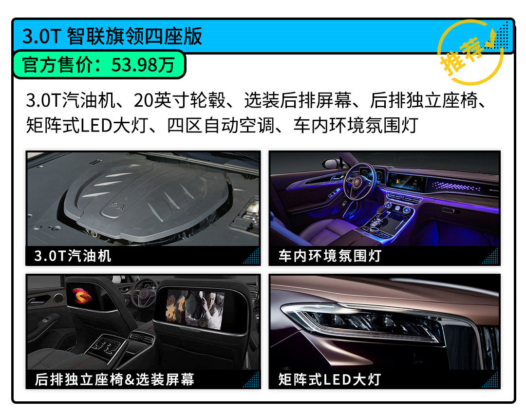 顶配的3.0T旗领四座版是全系最值得买的款式,光是后排两个独立座椅就足够说明问题了,能获得极致的舒适性体验。而3.0T引擎的参数虽与2.0T相差不大,但请相信我,多缸大排量车,无论是开还是坐,行驶体验和品质都比马力相近的小排量车更好。至于性价比,这是顶配红旗H9潜在用户会考虑的问题吗?