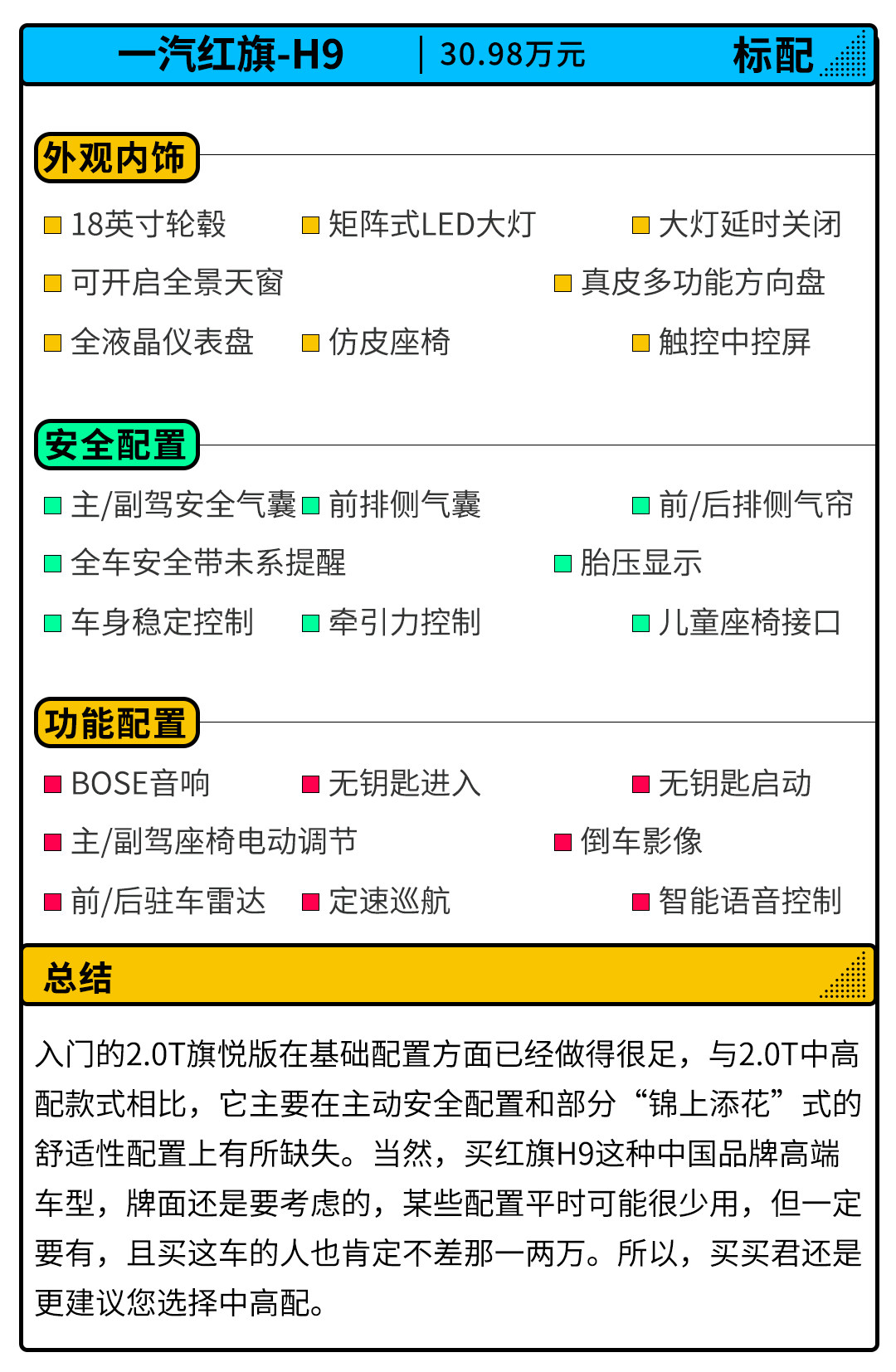 理性层面看,入门的2.0T旗悦版的配置水平虽然也足够日常使用,但红旗H9作为一款豪华车,舒适性配置上的欠缺难免让用户在感性层面有根拔不掉的刺,所以入门的2.0T旗悦版并不是最好的选择。