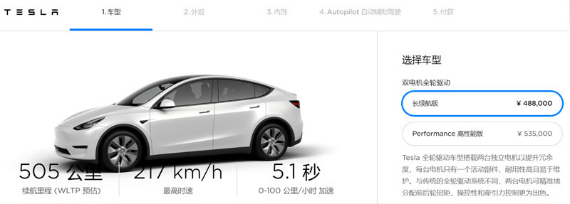其次,特斯拉明年初正式启动Model Y车型的国产化进程,将在上海超级工厂下线,并开始交付。其中长续航全轮驱动版WLTP工况下续航为505公里;而Performance高性能版WLTP工况下续航为480公里。