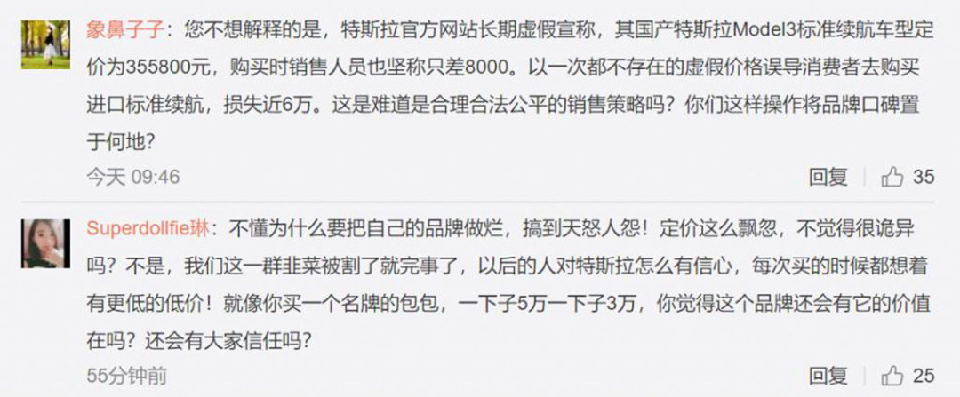 而国产Model 3不到3个月时间降至30万以内这一事情很快就遭到了老车主的吐槽,甚至有车主成立车主维权群,在特斯拉官博及特斯拉对外事务副总裁陶琳微博下吐槽,甚至发酵到部分车主在特斯拉体验店拉起了横幅表示不满。