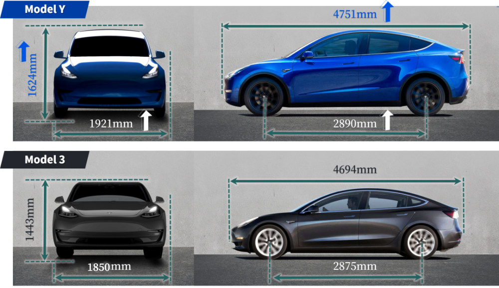 不过,相比Model 3,Model Y也有改动比较大的地方,车身尺寸就是其中之一。具体来说,就是比Model 3长57mm,宽了71mm,高181mm,而这也是为何教授觉得它更像是拉高版Model 3的一个重要原因。