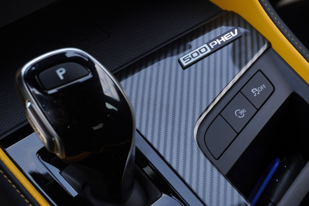那这辆插电混动版车型与燃油版车型有什么区别呢?看到档把旁边的500 PHEV铭牌了吗?这就是区分它们之间的区别。