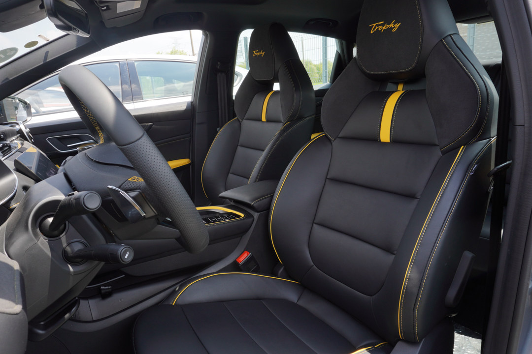 进入车内,可以发现插电混动版车型与燃油版车型的布局以及内饰颜色上的处理一致,Trophy系列搭载了专属的炽烈黄皮质内饰,不仅如此,细节处还增加了仿碳纤维纹路装饰以及类似Alcantara的翻毛皮面料来增强豪华感。似乎无时无刻都在提醒我:我不只是空有其表,我有性能范。