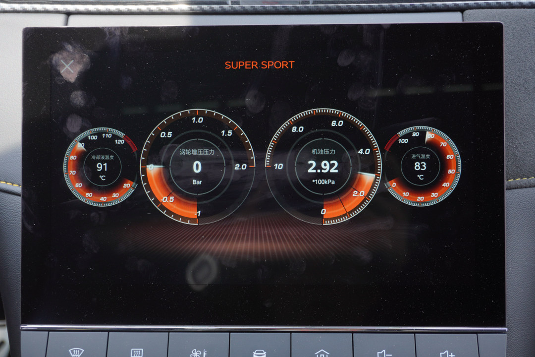 在开始跑之前,有一个小小的仪式感是需要操作的,那就是仪表盘上的SUPER SPORT按键。按下这个按键车辆会切换到运动模式,仪表盘切换成极具战斗风格的红色,动力响应也会得到提升,同时再这个模式下中控显示屏会显示车辆的机油压力、涡轮增压压力等,非常像一些玩改装车的车友会后期加装的四联表,嗯,有那味了。