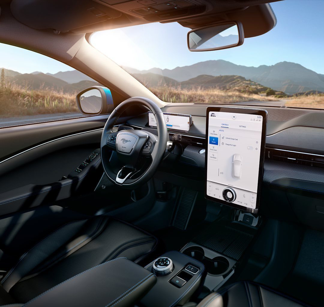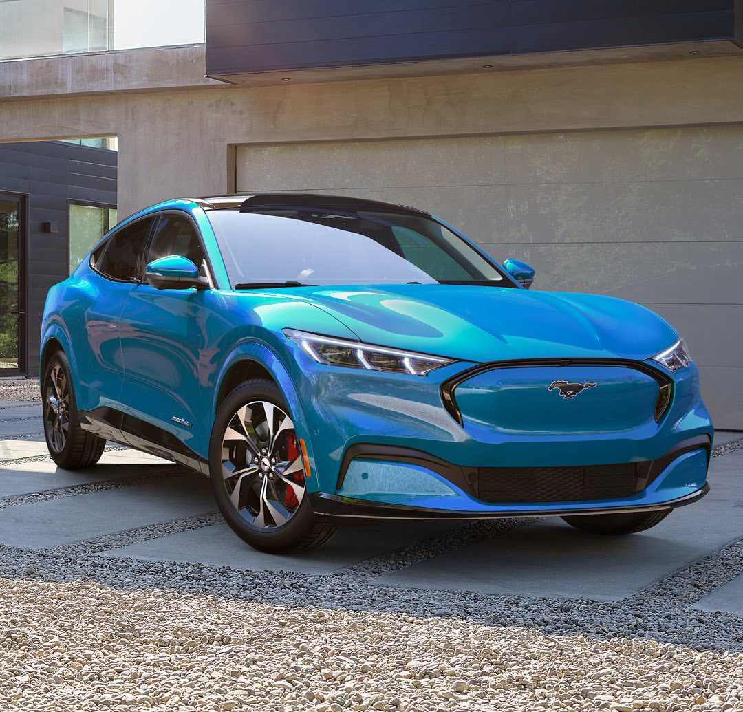 Mustang Mach-E极其强调福特Mustang风格,如经典的闭式前格栅、Mustang标志性三条柱形尾灯、以及Fastback的车身造型等。无处不在的野马标识,也在宣示着这台车序属Mustang家族身份。