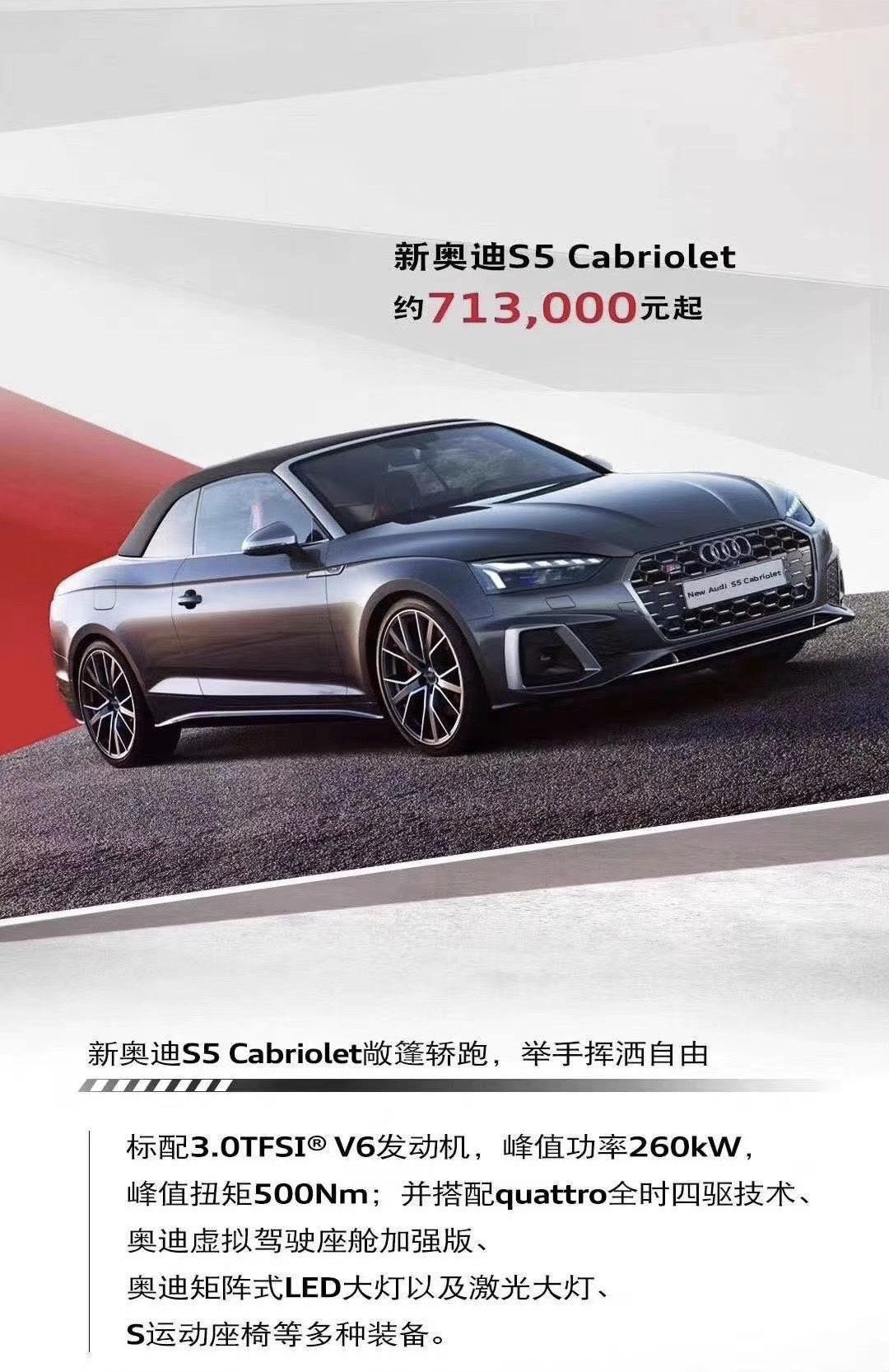 其中,S4和S5三款车型搭载3.0TFSI涡轮增压V6汽油机,最大马力354匹,峰值扭矩500牛·米,匹配8AT和全时四驱。