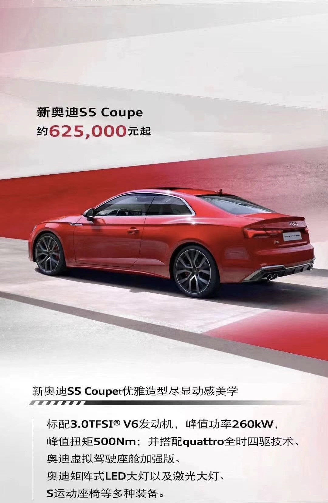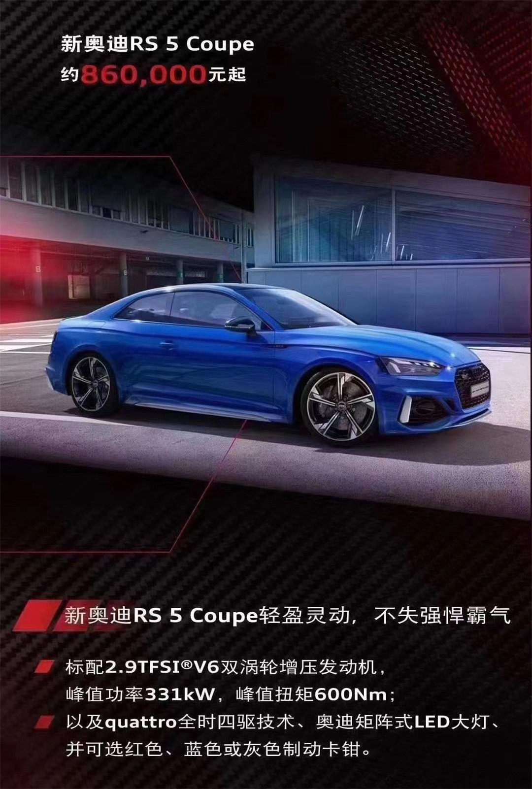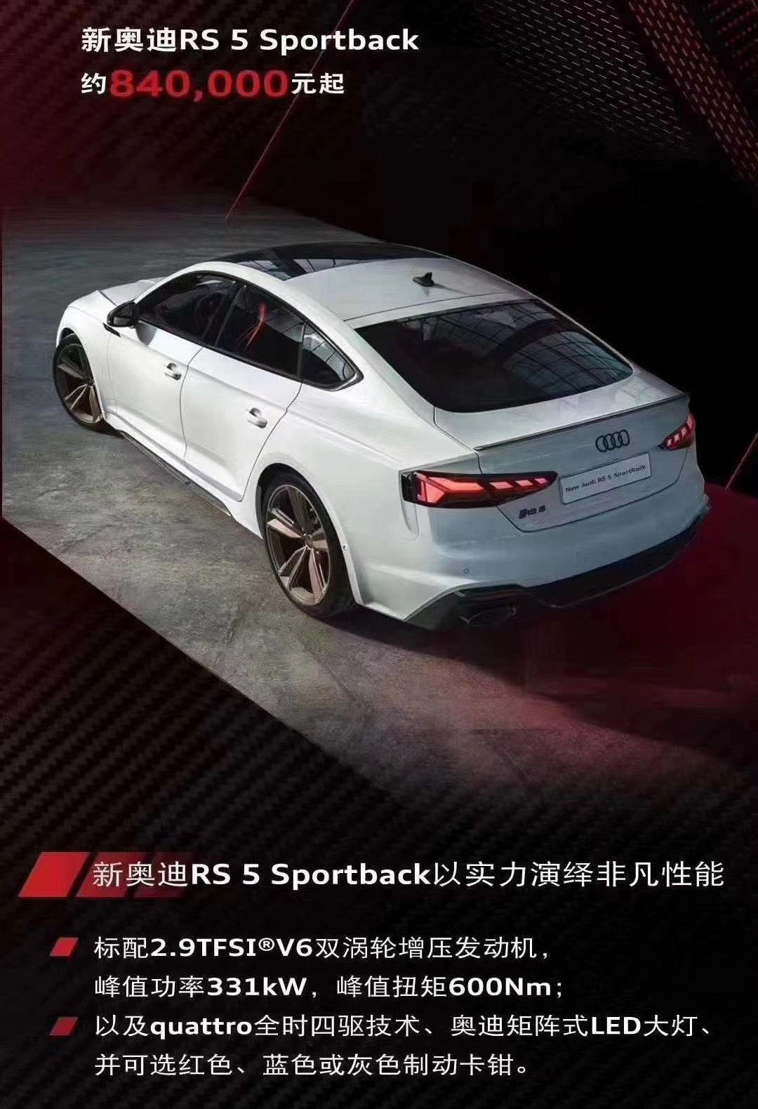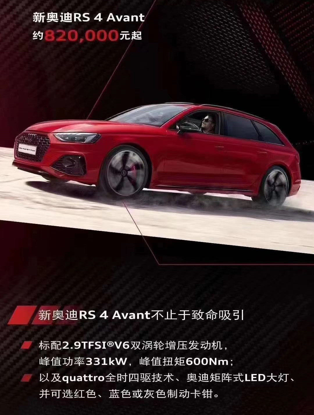 而RS 4 Avant和RS 5两款车型也搭载2.9TFSI双涡轮增压V6汽油机,最大马力450匹,峰值扭矩600牛·米,匹配8AT和全时四驱。